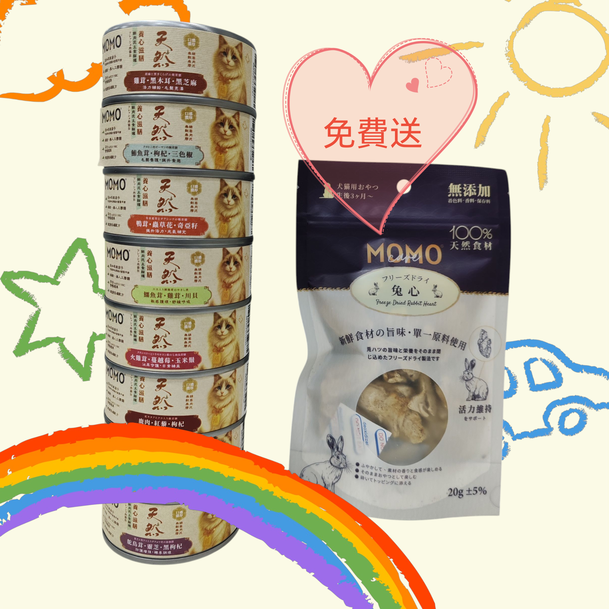 MOMOcare 的「天然養心滋膳鮮肉泥主食貓罐」。 產品特色: 採用東方食養理念,結合現代營養科學,專為貓咪設計的情緒營養平衡主餐。 成分: 嚴選沙參、玉竹、蟲草花、紅藜、枸杞等天然輔料,搭配溫和的清燉湯底調理。 營養標準: 符合AAFCO/NRC 主食營養標準,並添加魚水解蛋白、牛磺酸、卵磷脂與維生素等營養素。 配方: 無香料、無膠類、無穀配方。 八種唔同口味分享 1:火雞茸 蔓越莓 粟米鬚 2: 鹿肉 紅藜 枸杞 3: 鷓鴣 沙參 玉竹 4: 鴕鳥 靈芝 黑枸杞 5: 鱷魚 雞茸 川貝 6: 雞茸 黑木耳 黑芝麻 7: 鮪魚 枸杞 三色椒 8:鸭茸 蟲草花 奇亞籽